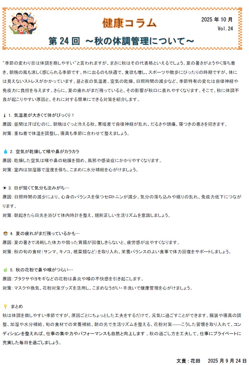 タック健康人間宣言 2025.9月号 健康コラム 2025.8月号 タック健康人間宣言 2025.7月号 健康コラム 2025.6月号 タック健康人間宣言 2025.5月号 健康コラム 2025.4月号 タック健康人間宣言 2025.3月号 タック健康人間宣言 2025.2月号 タック健康人間宣言 2025.1月号