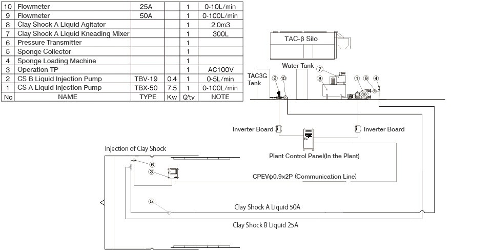 Clay Shock is a highly viscous, plastic-type filling material—approximately 300 to 500 dPa·s—produced by proportionally mixing Clay Sand TAC-β (βⅡ) solution with the special water glass TAC-3G. This construction method utilizes Clay Shock to achieve effective ground conditioning and filling performance.