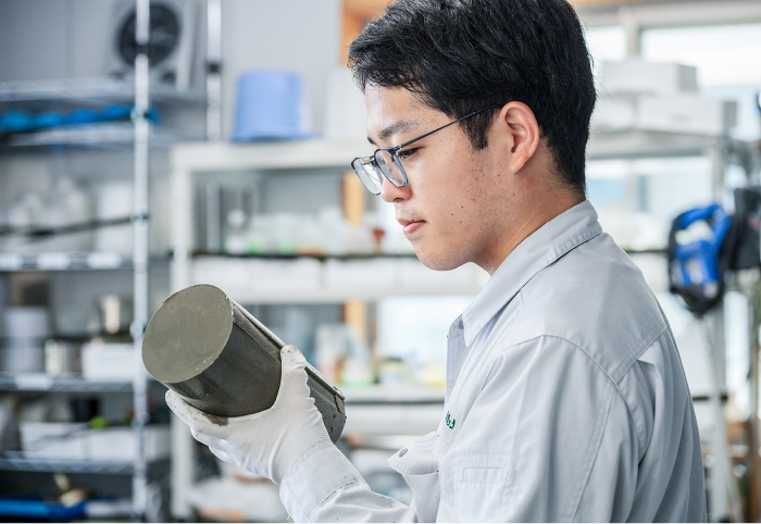 Before joining the company, I imagined research and development to be work done mostly within a laboratory. In reality, however, a large portion of the role involves quality control, and it is not uncommon to visit construction sites for property verification tests. On average, I go to the site once or twice a month. There are many things that cannot be understood without seeing the site firsthand, which makes the work highly engaging. Witnessing our materials being used in actual operations boosts my motivation, and hearing directly from site teams about how our products are performing gives me a strong sense of fulfillment.