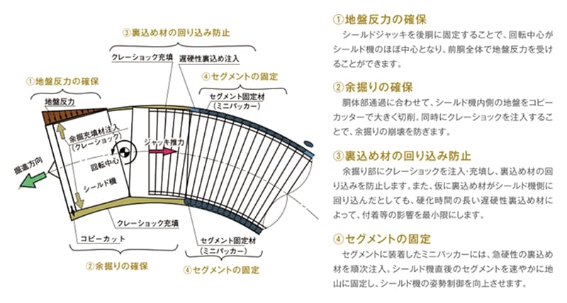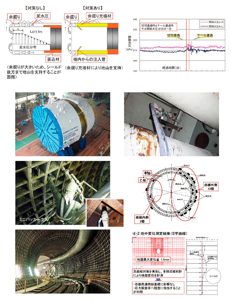 技術難度の高い急曲線施工には、さまざまな補助工法が必要とされ、従来は地上からの地盤改良工事によって対応してきました。クレーショックを用いた「クレーショック・ミニパッカー工法」は、こうした制約条件下でも確実な掘進を実現し、周辺環境への影響を最小限に抑えることができます。