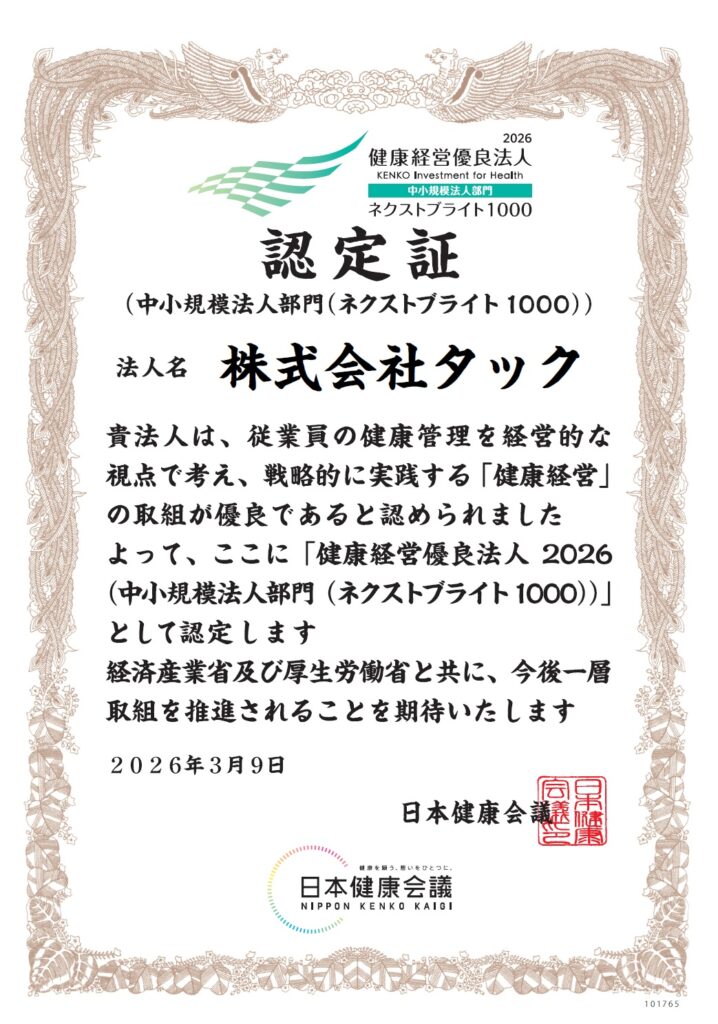 健康でいつまでも働ける会社を目指して取り組んでいきますので、 今後ともタックをよろしくお願いします。