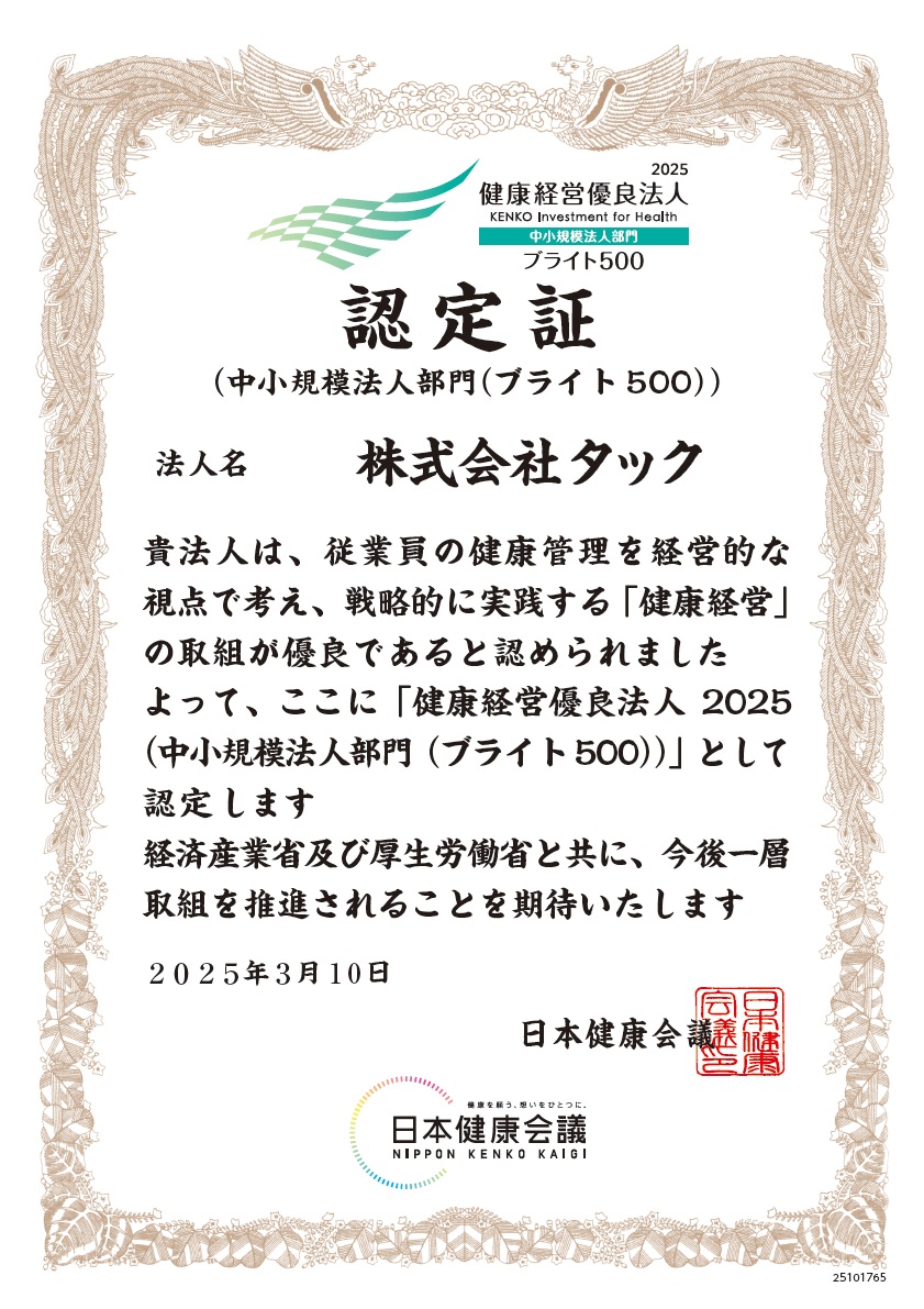 タックが、8年連続受賞となる「健康経営優良法人2025」に、その中の認定法人のうち上位500社に授与される「ブライト500」(5年連続受賞)の認定を受けました!