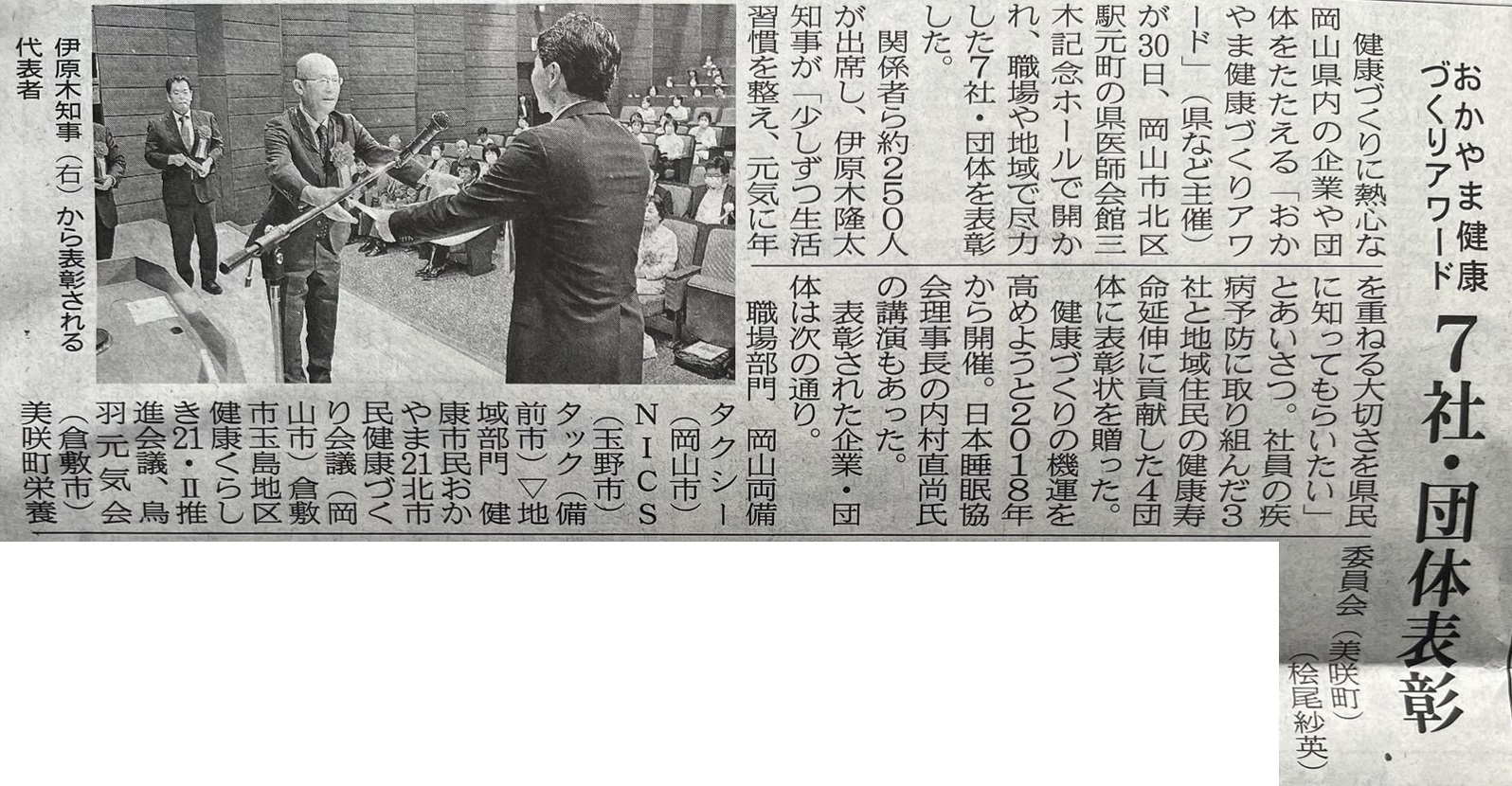おかやま健康づくりアワードとは、健康づくりに熱心な県内企業をたたえるものとなっています。