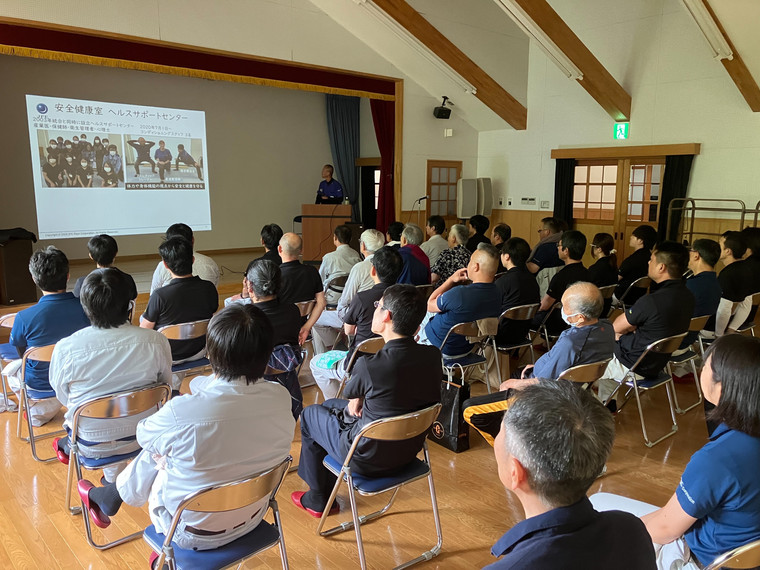 7/25に岡山産業保健総合支援センターに依頼し、吉永町南方会館にてJFEスチール株式会社 安全健康室 ヘルスサポートセンター 産業アスレティックトレーナーの乍(ながら)先生による「転倒・腰痛予防セミナー」を行いました。