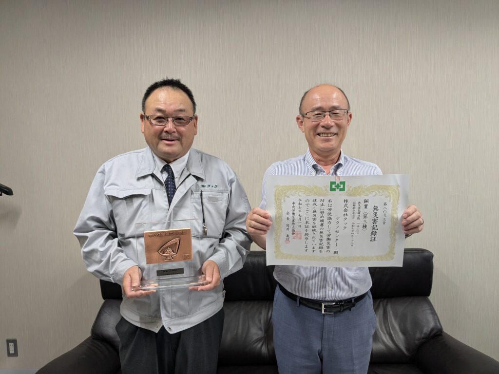 このたび「中小企業無災害記録証(第三種・銅賞・1,500日)」の記録証ならびに盾を授与いただけることとなりました。